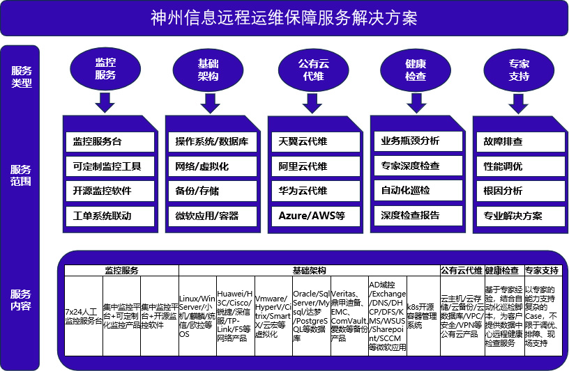集中监控平台、可定制化监控工具、开源监控软件、安全堡垒机、ITSM工单系统等,构成远程运维保障服务矩阵。